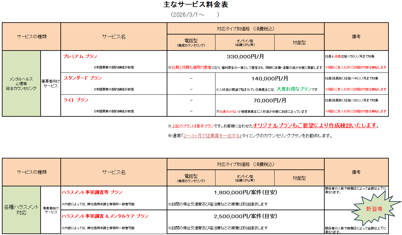 下記が、当オフィスの事業者向けサービスの料金表です。