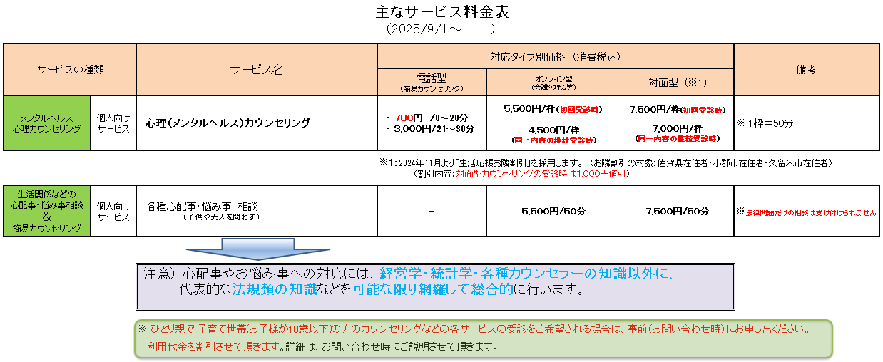 個人向け メンタルヘルス心理カウンセリング & 各種お悩み相談 料金表